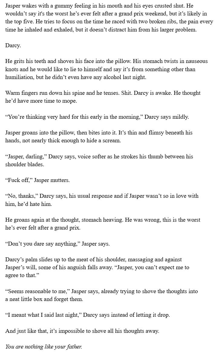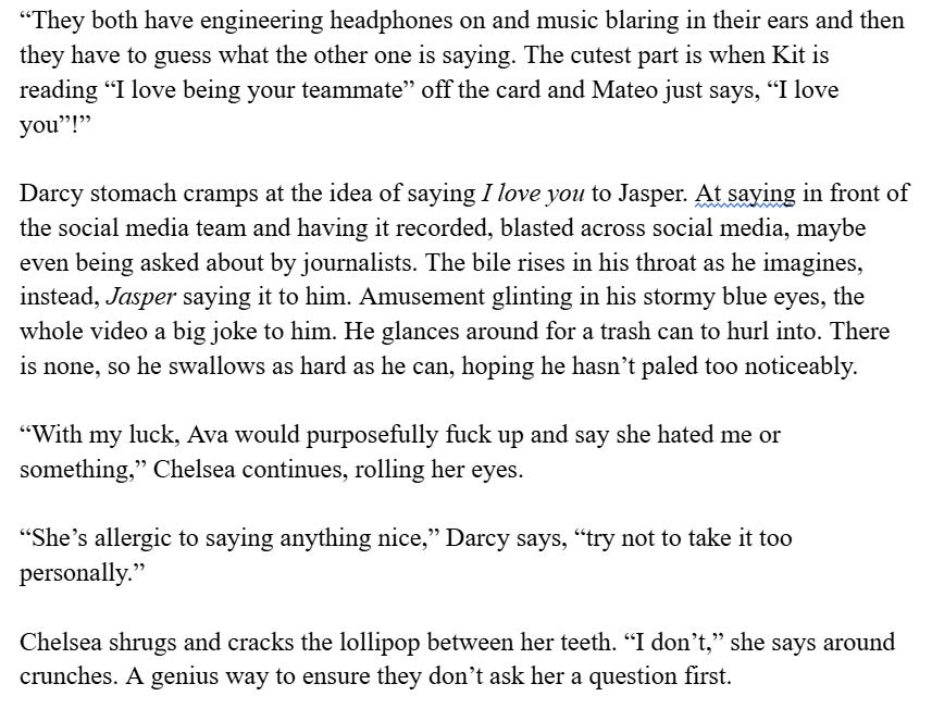 It’s very different than Jasper & Darcy’s book. The trust gained between the two main characters is built on amusement and humor. There is tension and chemistry, but their conflict doesn’t come from being in F1. They have mutual goals to make the team as good as they can. And while this book isn’t devoid of sex or sexuality, the characters don’t actually have any sexual physical intimacy until quite late. This is in direct contrast to Darcy and Jasper’s relationship, because they build emotional intimacy through physicality.