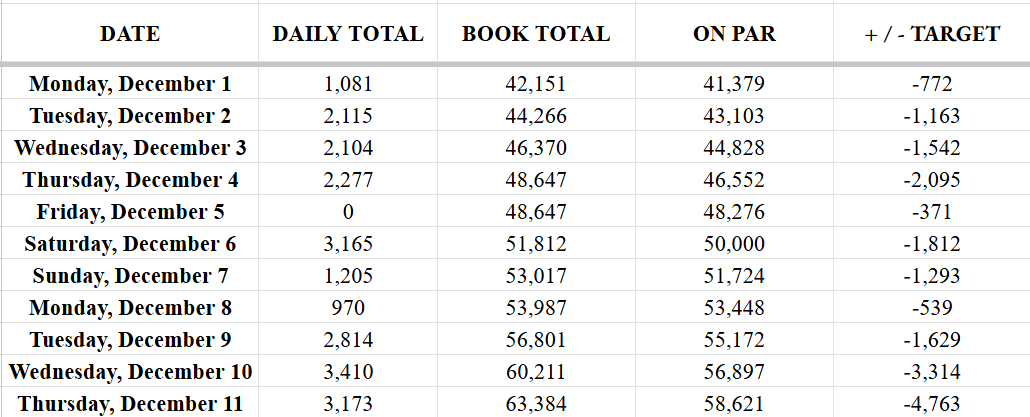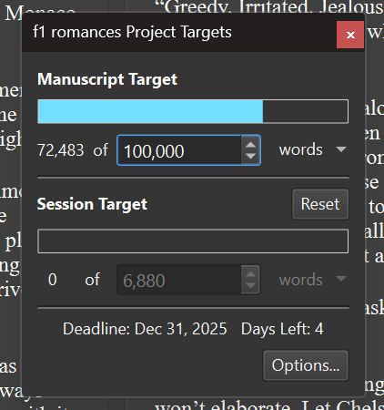 So, I won’t be finishing this book this month. I’ve accepted that, and as long as I put in good work and get closer to the end every day, I’ll be moving ahead. I took a lot of days off for Christmas, and now I’m locked in and ready to dive back in.