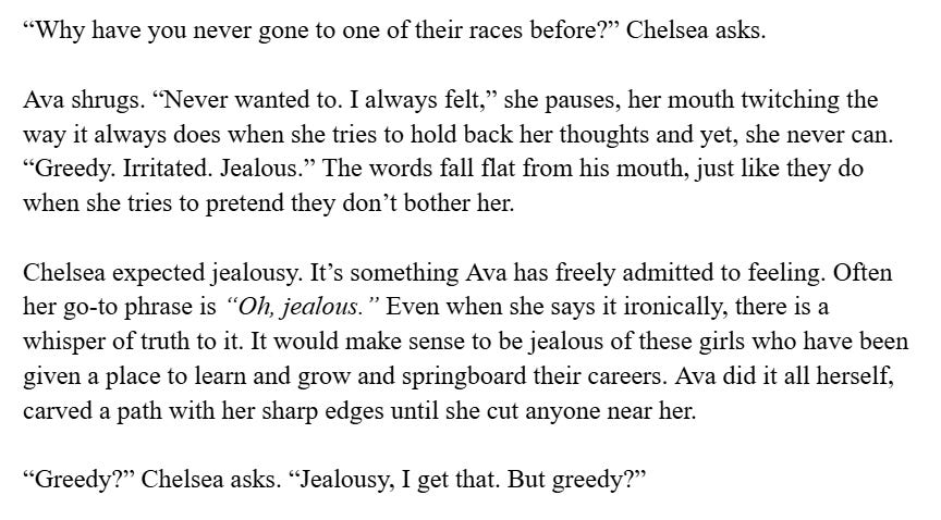 (This is not the interesting angle I thought of, it’s too spoilery to share, but here is a little bit of Chelsea and Ava as characters, within Chelsea’s head as opposed to the very biased one of Darcy and Jasper.)