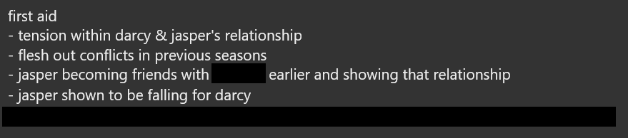 But those tangents, while they may get cut later, have helped me understand who Darcy and Jasper are, how they interact, and they’ve become more fully formed on the page, as opposed to just in my head. But there are definitely plot threads and ideas that I’ve dropped the ball on. And when I was lamenting about this to a few of my fellow writers, my friend, Malin, suggested I make a document entitled First Aid and make note of all the things I need to sort out when I go into revisions. I love the name, and I love the intention behind this. If I acknowledge what I need to do, I can let it go for now, instead of letting it fester and bother me. And calling it something cutesy and a little silly makes it even more fun.
