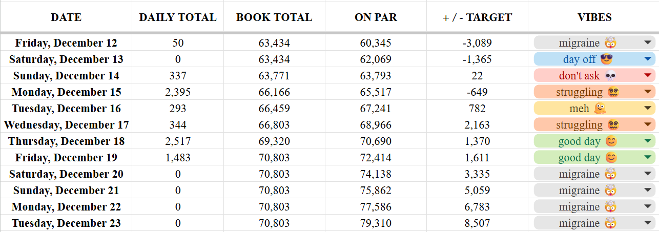 My progress slowed, I started to feel sluggish, and my writing became more clunky. Not burnt out, but definitely struggling with everything on my plate. Because I couldn’t just disappear into the void to write, the holidays were right around the corner, and then a migraine stole four days from me.