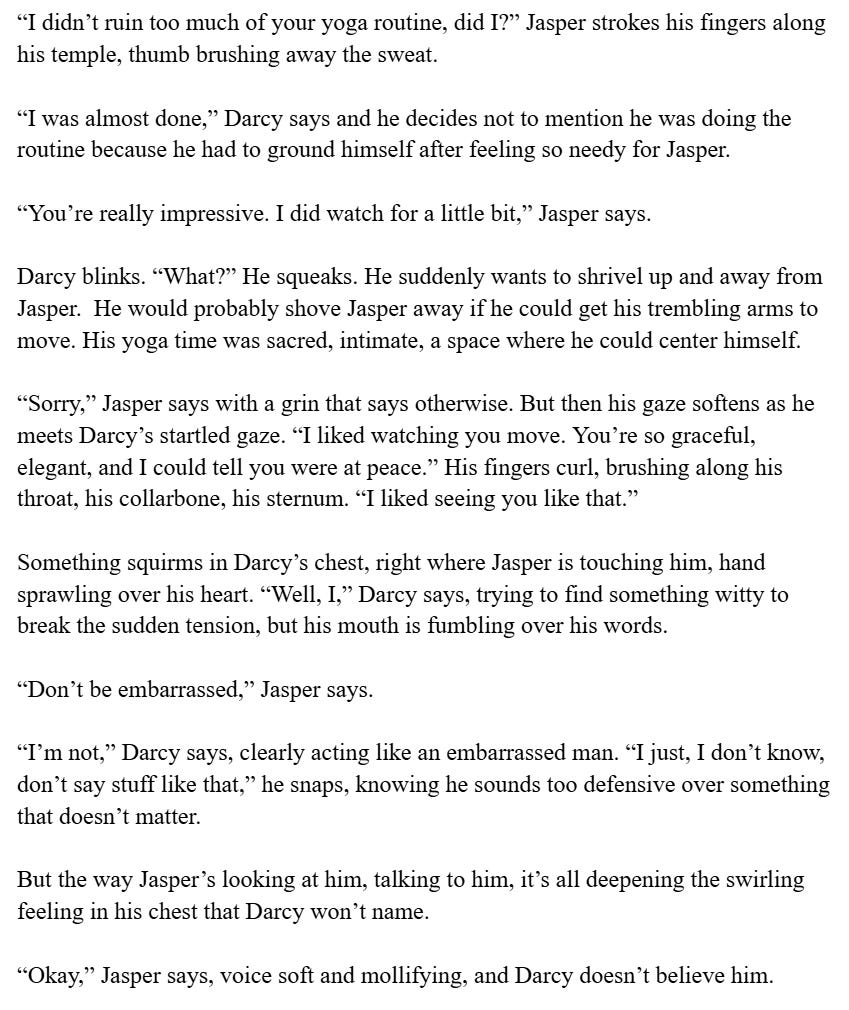 This piece is a bit more about Darcy and Jasper’s relationship at this point in the book, but of course, there are little glimpses. (And a little moment of Kit & Mateo’s relationship. Kit is in this scene with Darcy & Chelsea too.)
